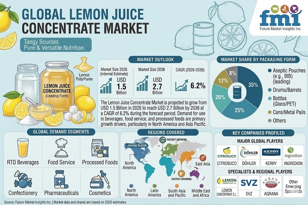NEWARK, Del., USA | April 27, 2026 — According to Future Market Insights (FMI), the global lemon juice concentrate market is projected to grow from USD 1.5 billion in 2026 to USD 2.7 billion by 2036, registering a CAGR of 6.2%. Growth is being driven by increasing preference among beverage formulators, foodservice operators, and ingredient manufacturers for standardized lemon inputs that offer consistency, extended shelf life, and operational efficiency.