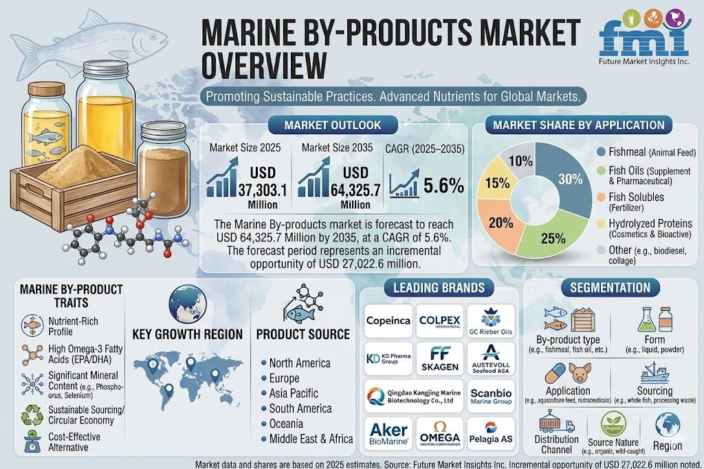 NEWARK, Del., USA | April 27, 2026 — According to the latest analysis by Future Market Insights (FMI), the global marine by-products market is projected to grow from USD 37,303.1 million in 2025 to USD 64,325.7 million by 2035, registering a CAGR of 5.6% during the forecast period. Growth is being fueled by rising demand for sustainable marine ingredients across food, nutraceuticals, pharmaceuticals, cosmetics, and animal feed industries.