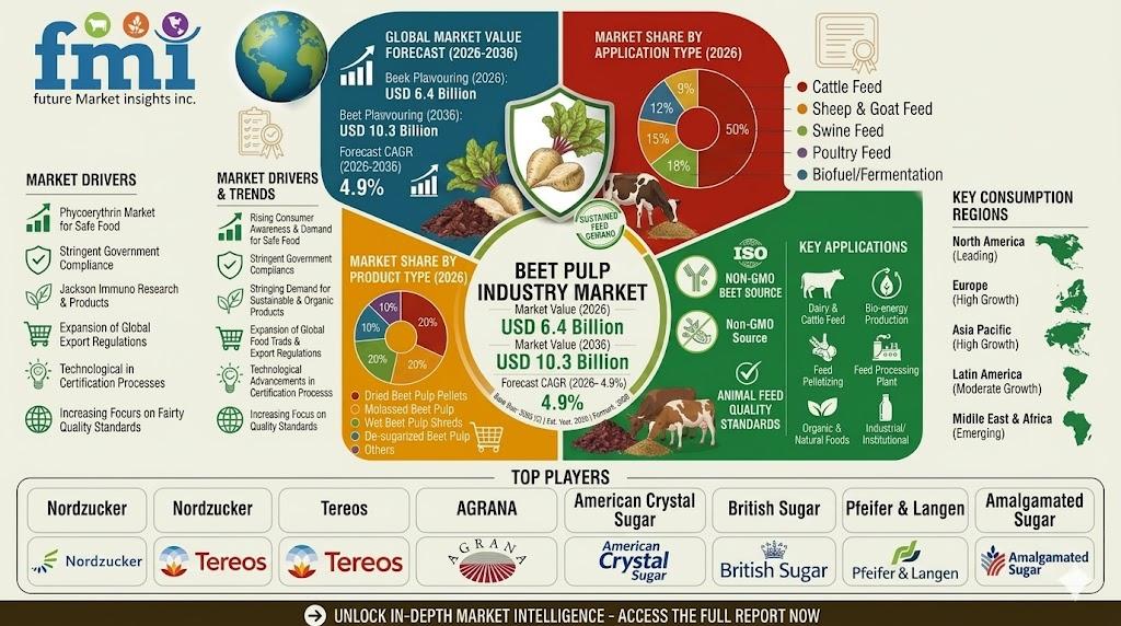 NEWARK, Del., USA | April 28, 2026 — According to Future Market Insights (FMI), the global beet pulp market is projected to grow from USD 6.4 billion in 2026 to USD 10.3 billion by 2036, registering a CAGR of 4.9%. Growth is being supported by sustained demand from livestock feed industries, cost-efficient fiber inclusion in feed formulations, and strong alignment with bulk feed programs and ration-cost optimization strategies.