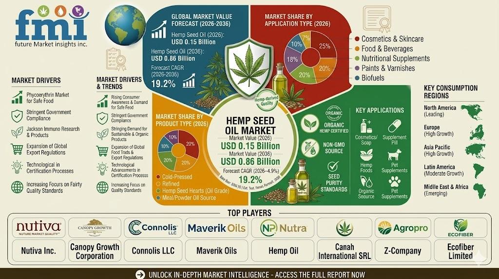 NEWARK, Del., USA | April 28, 2026 — According to Future Market Insights (FMI), the global hemp seed oil market is projected to grow from USD 0.15 billion in 2026 to USD 0.86 billion by 2036, registering a robust CAGR of 19.2%. Growth is being driven by increasing emphasis on compliance-ready sourcing, structured procurement practices, and expanding application across food, nutraceutical, and personal care industries.
